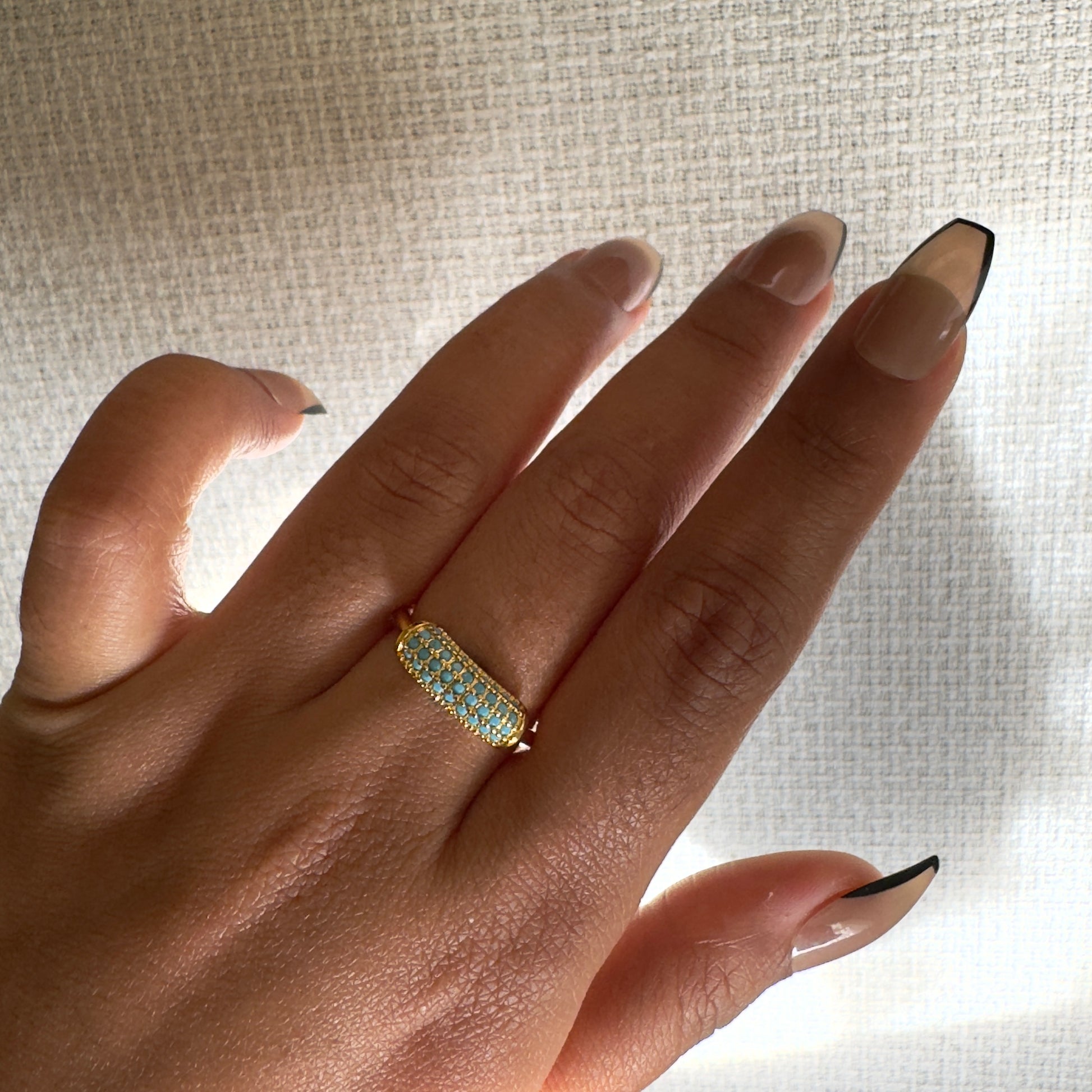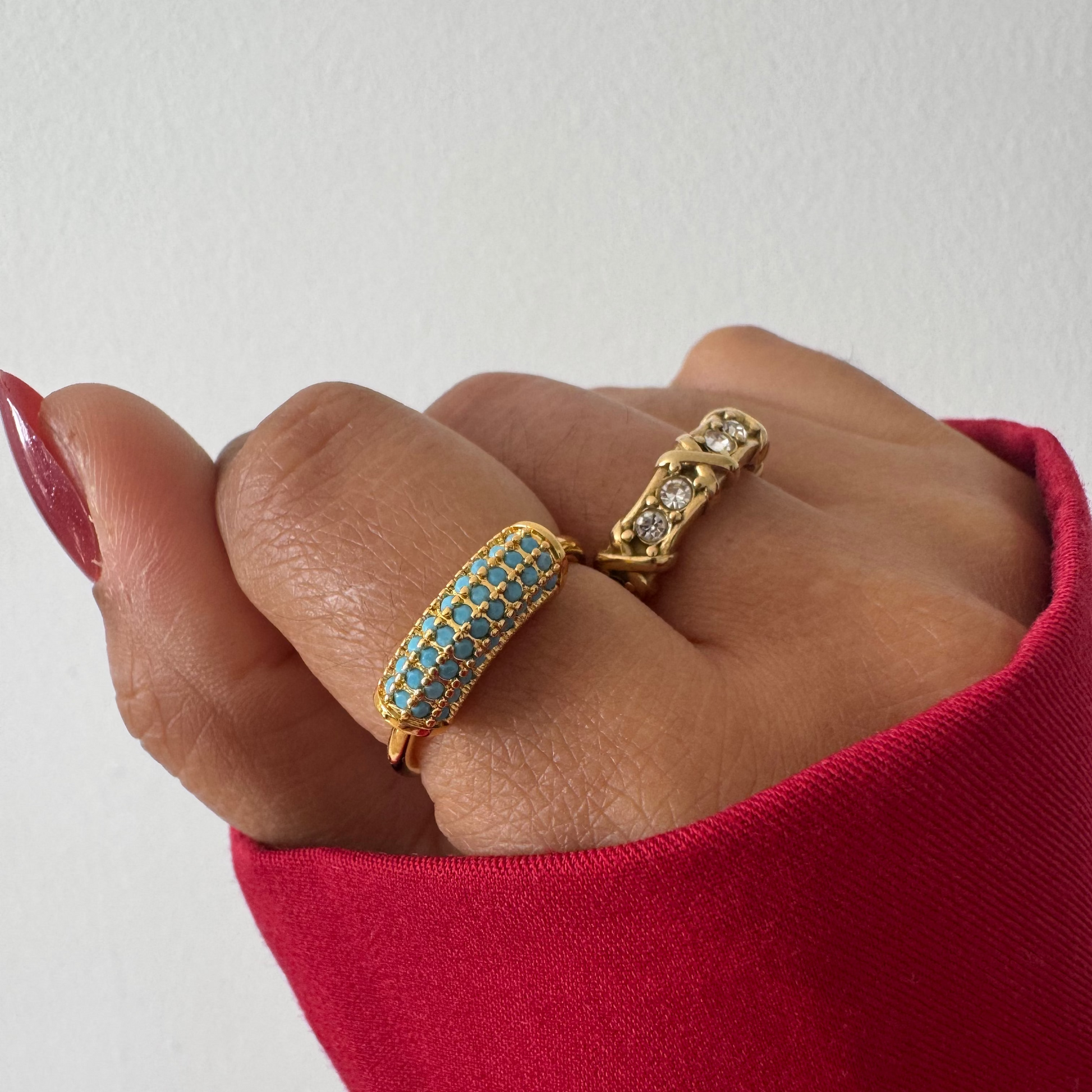This ring redefines minimal elegance with its sleek rectangular design. Featuring turquoise stones set in a polished gold lattice, it adds a refined pop of color to your everyday look. A versatile statement piece, perfect for stacking or wearing solo with effortless style.