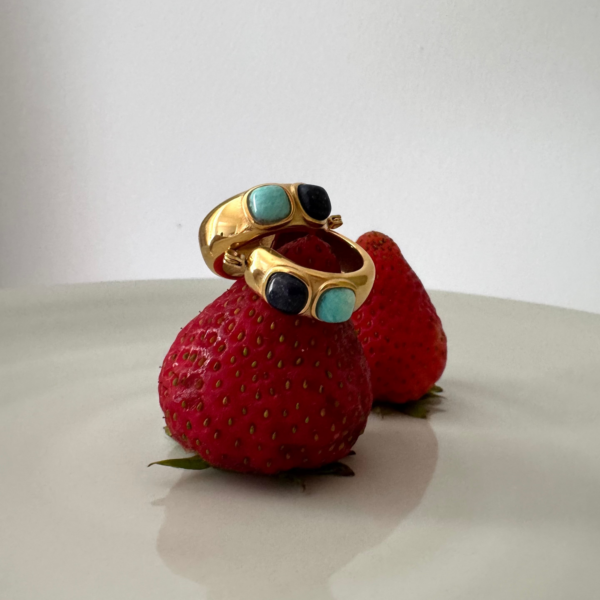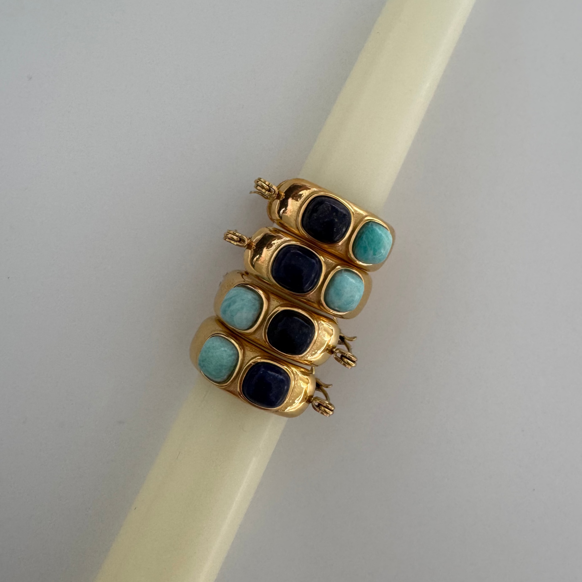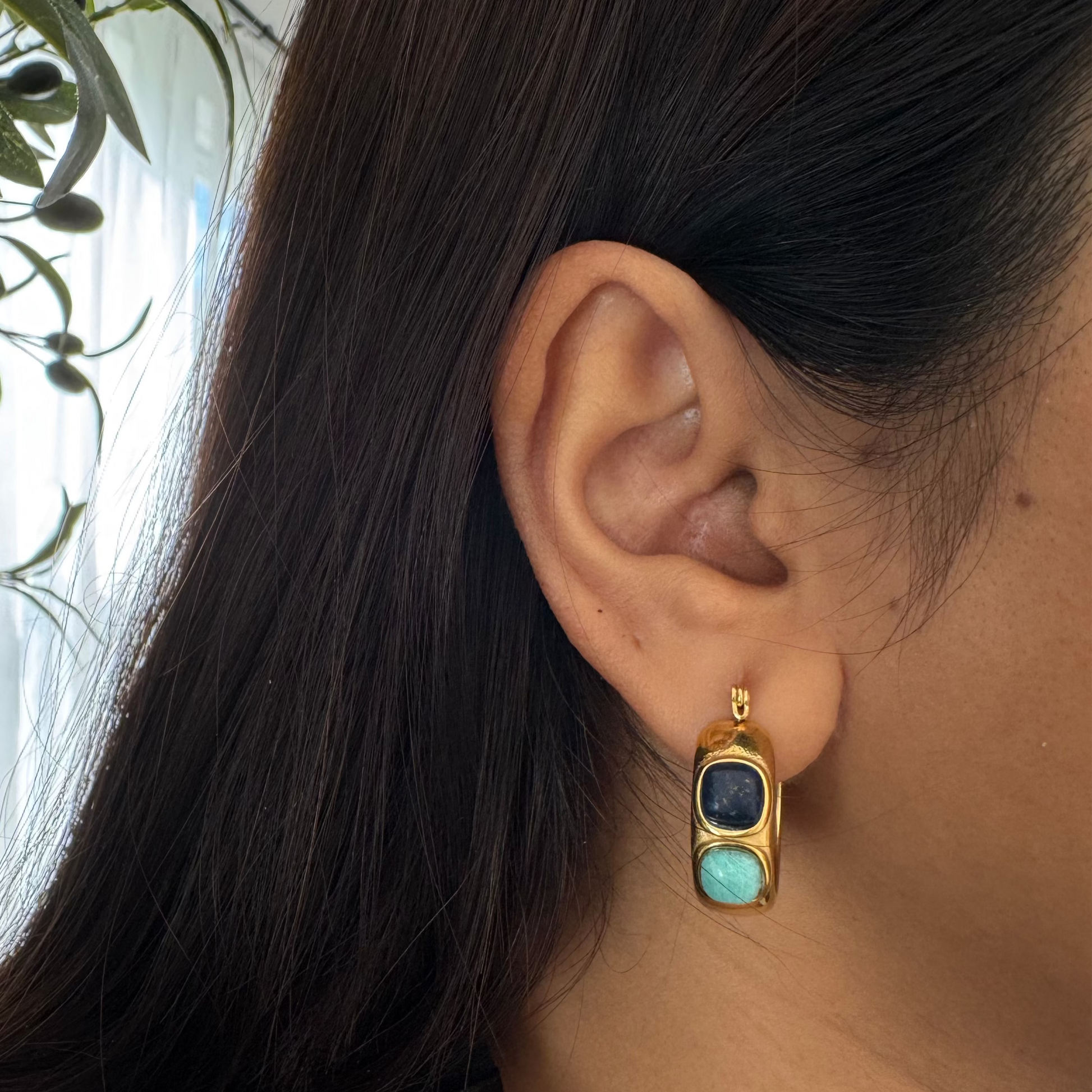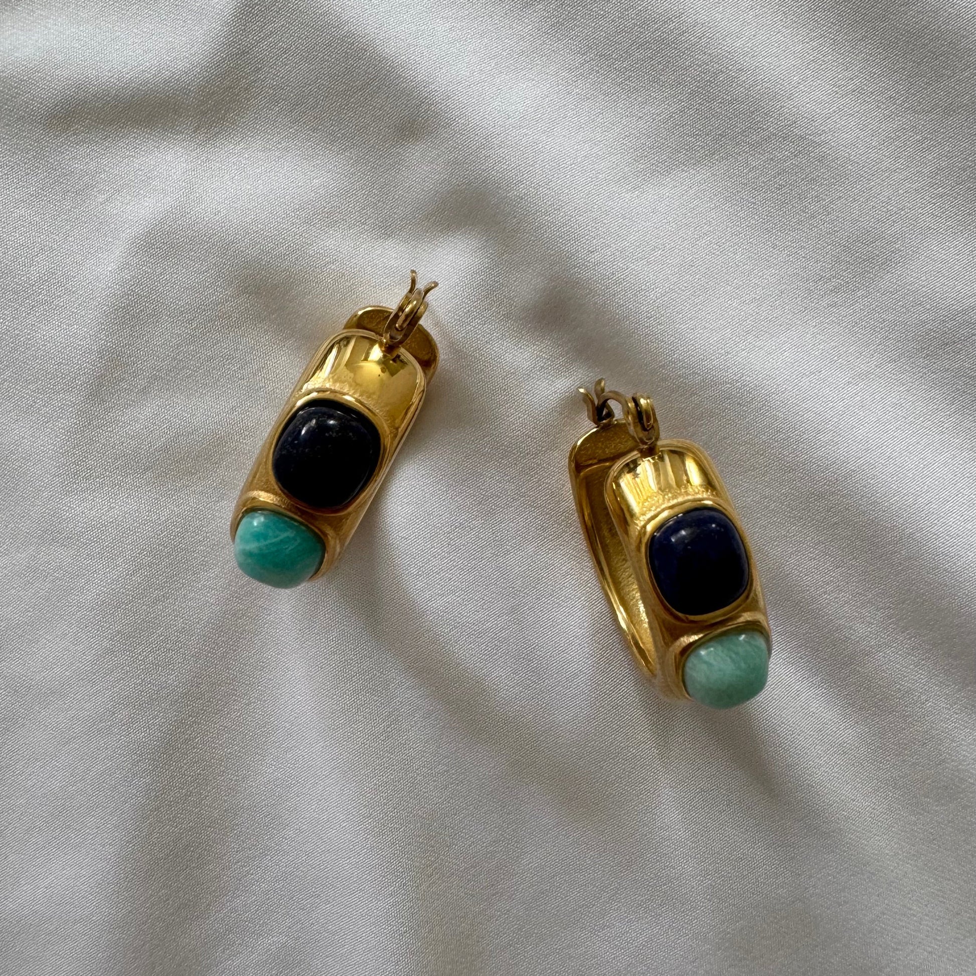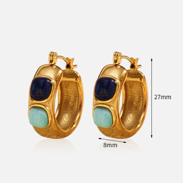 Bold gold-plated stainless steel hoops with dual-toned stone inlays- deep navy and soft aqua. A chunky, stylish statement for day or night.