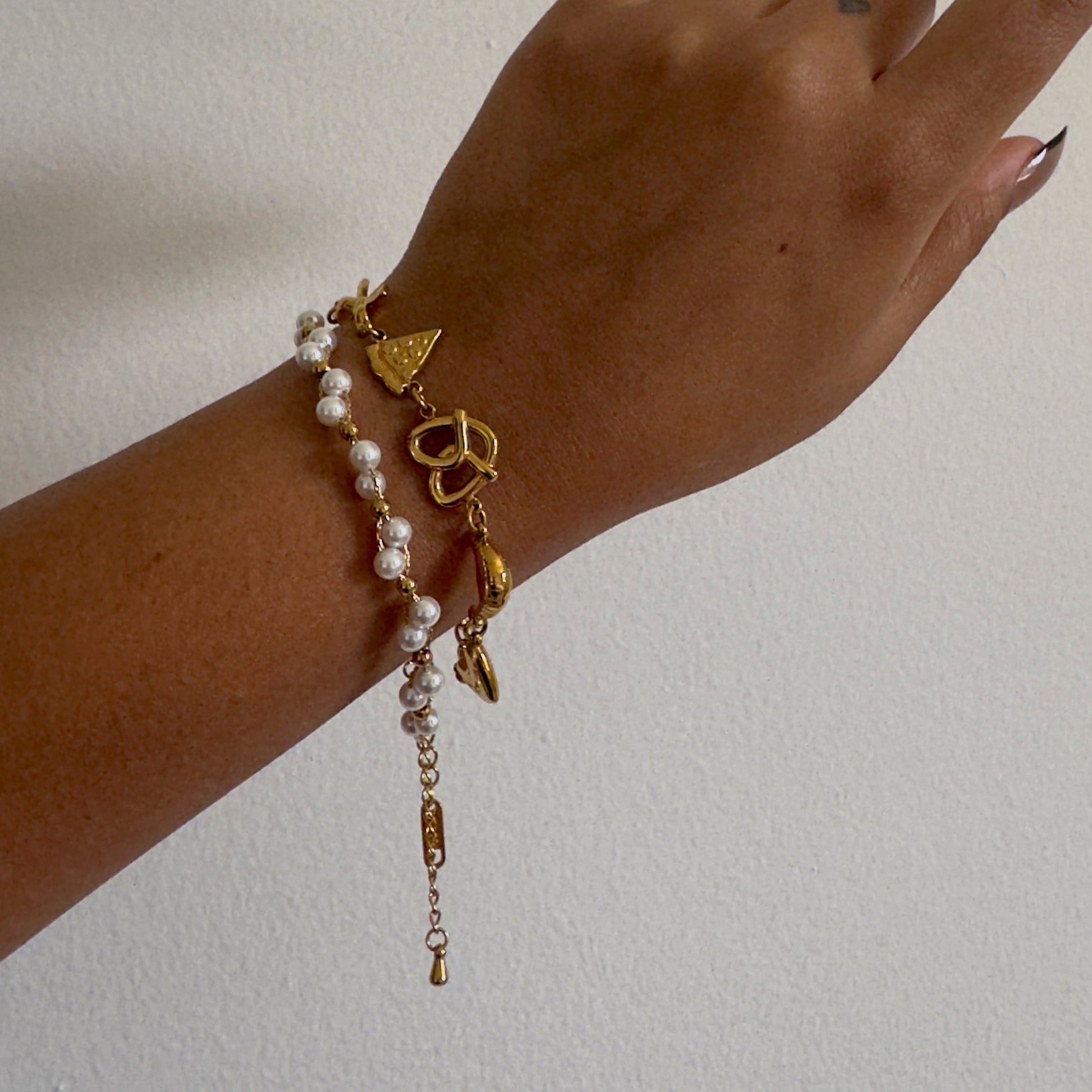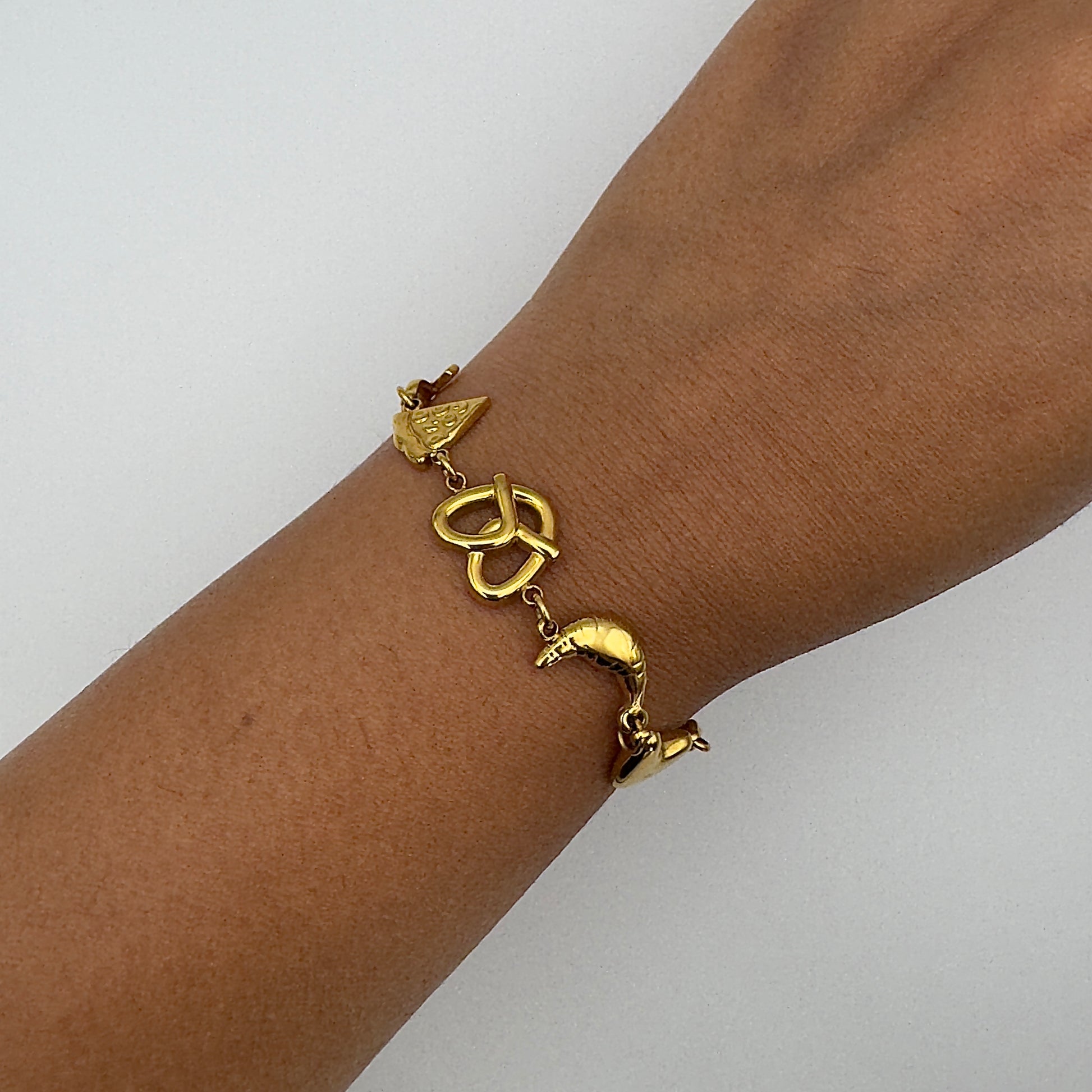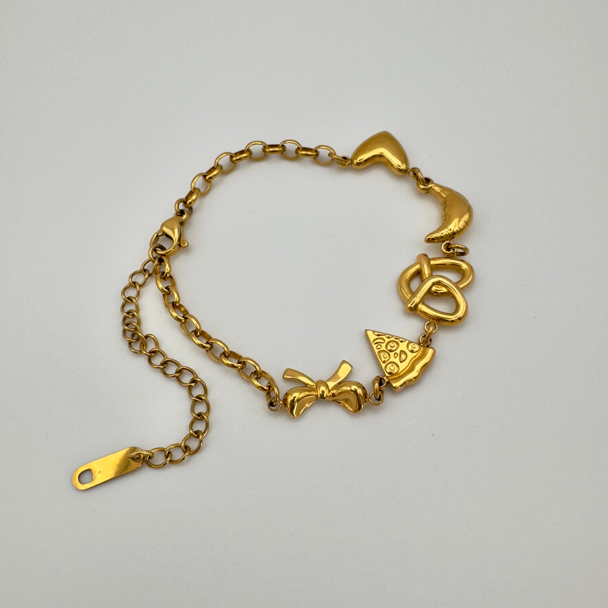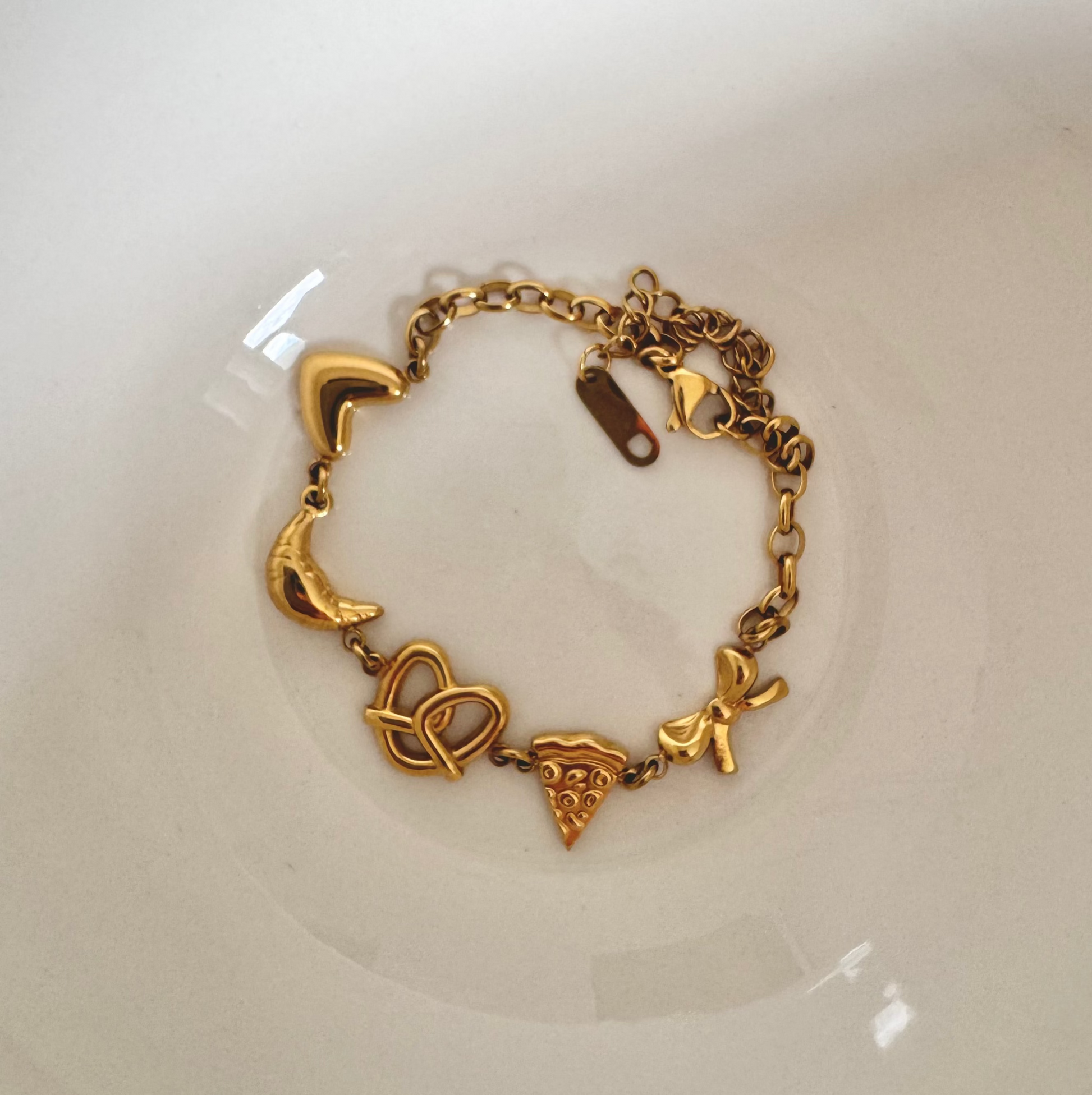 Bring a taste of la dolce vita to your look with the Capri Bracelet. Featuring whimsical charms — from a pretzel and pizza slice to a bow and seashell- this gold-plated stainless steel bracelet is both waterproof and hypoallergenic. Fun, carefree, and stylish, it’s the perfect accessory for vacations or everyday playfulness.
