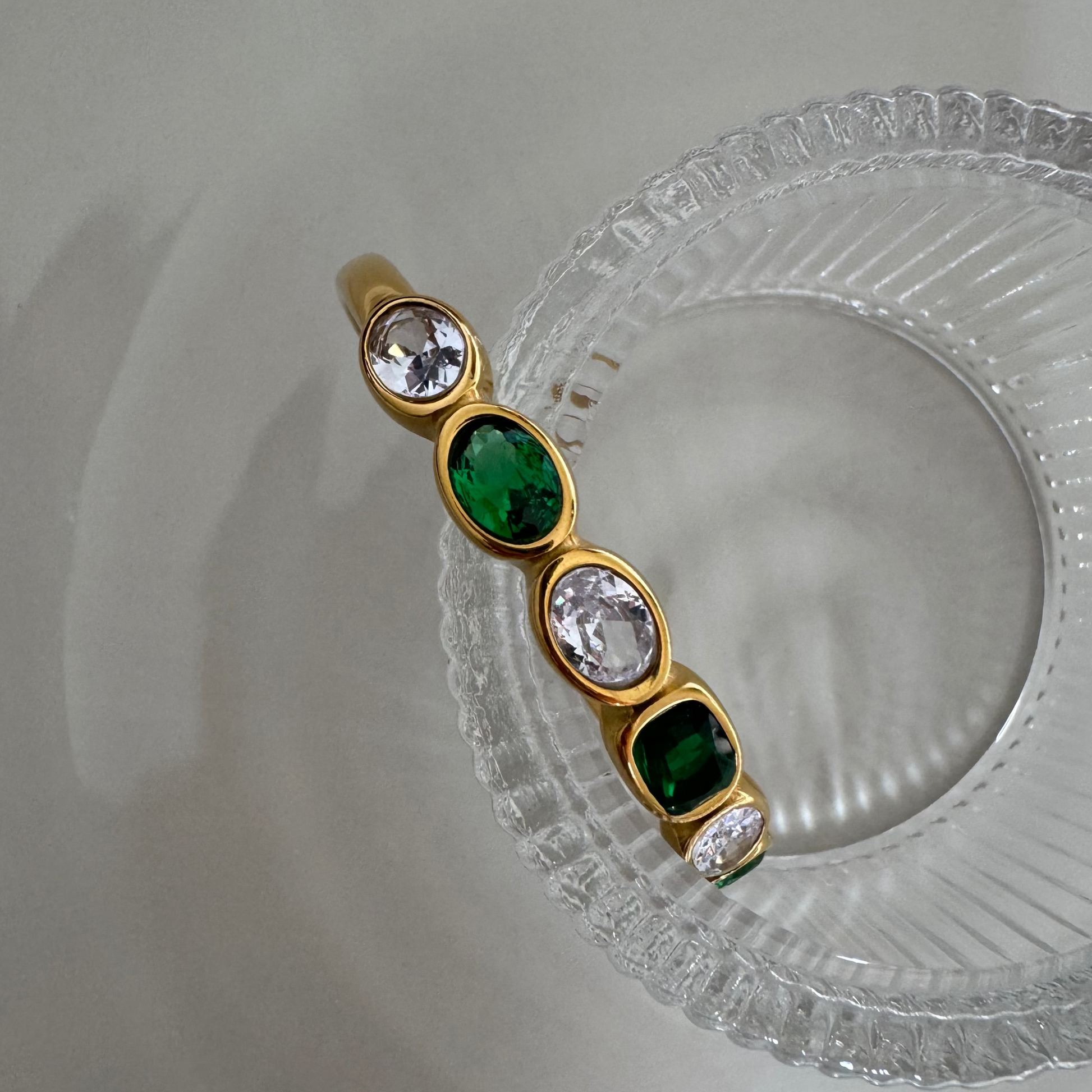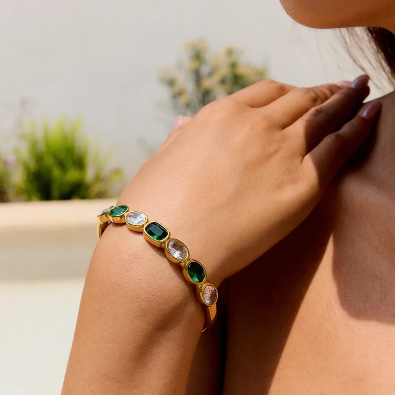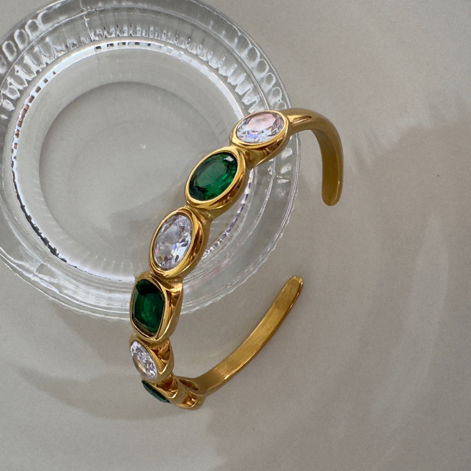 This cuff blends modern minimalism with timeless elegance. Set with alternating emerald-green and clear stones on a gold-plated band, this stainless steel cuff is waterproof, hypoallergenic, and designed for effortless luxury. A statement piece that transitions seamlessly from day to night.