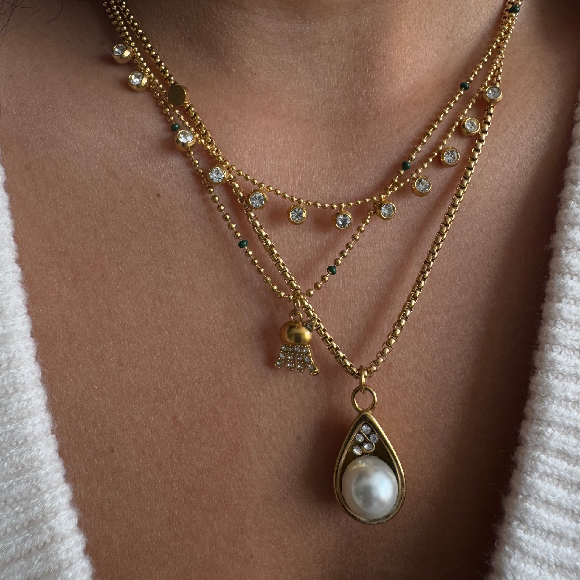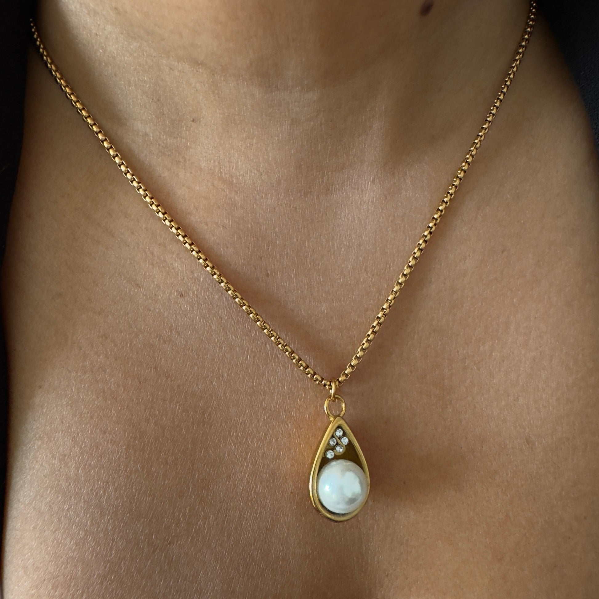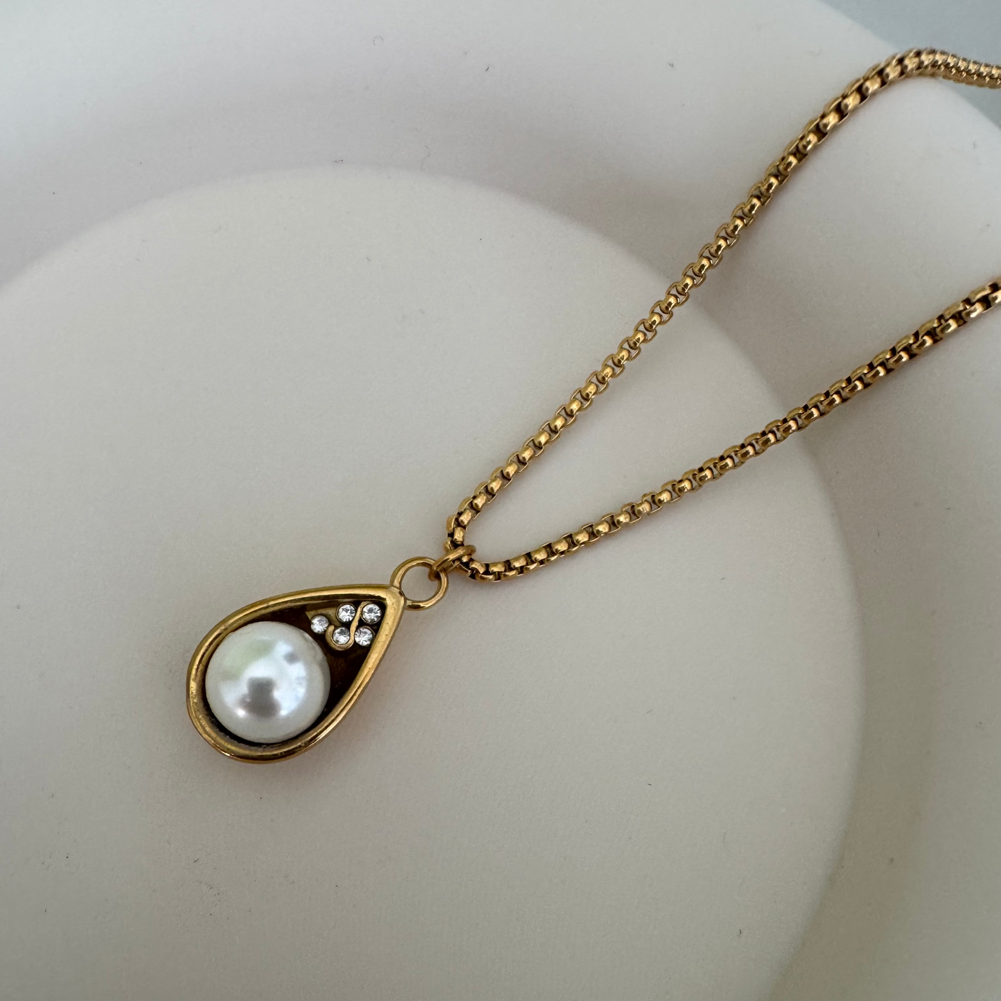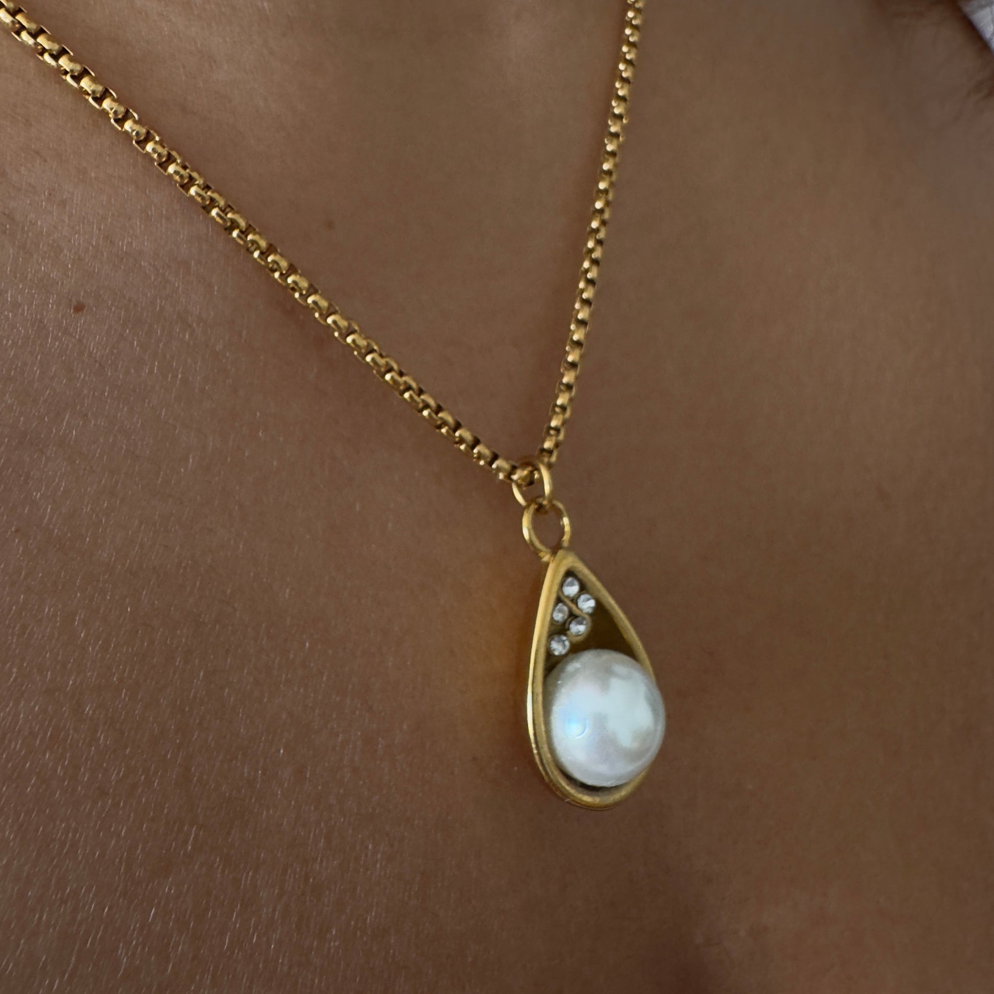 A teardrop gold-plated pendant cradles a luminous pearl, accented with delicate crystal detailing. Inspired by the timeless elegance of the French Riviera, this necklace blends classic charm with understated luxury, perfect for sunset soirées or everyday sophistication.