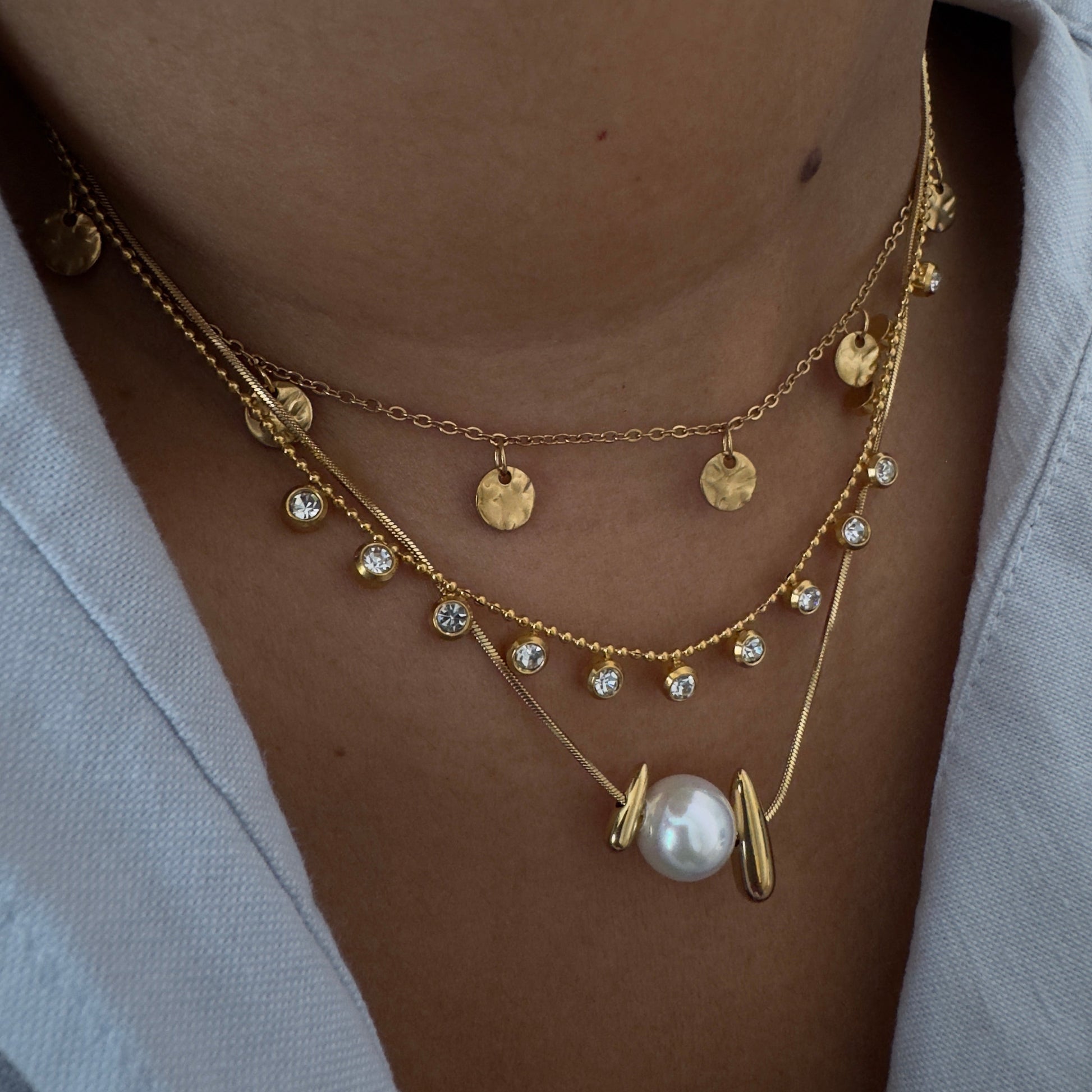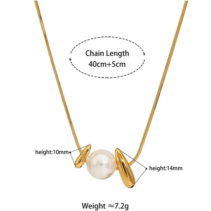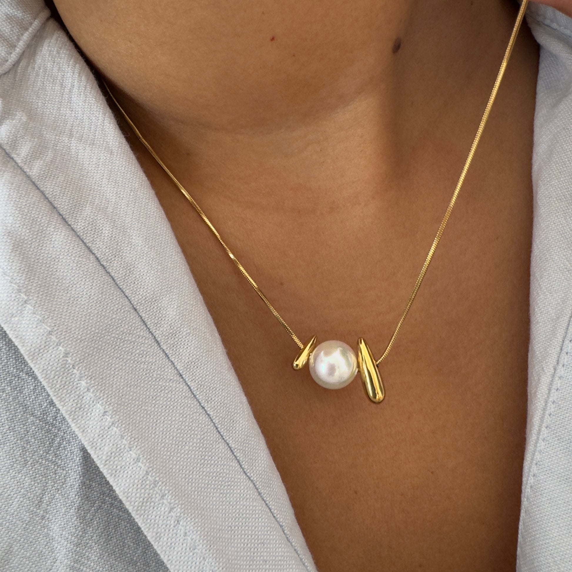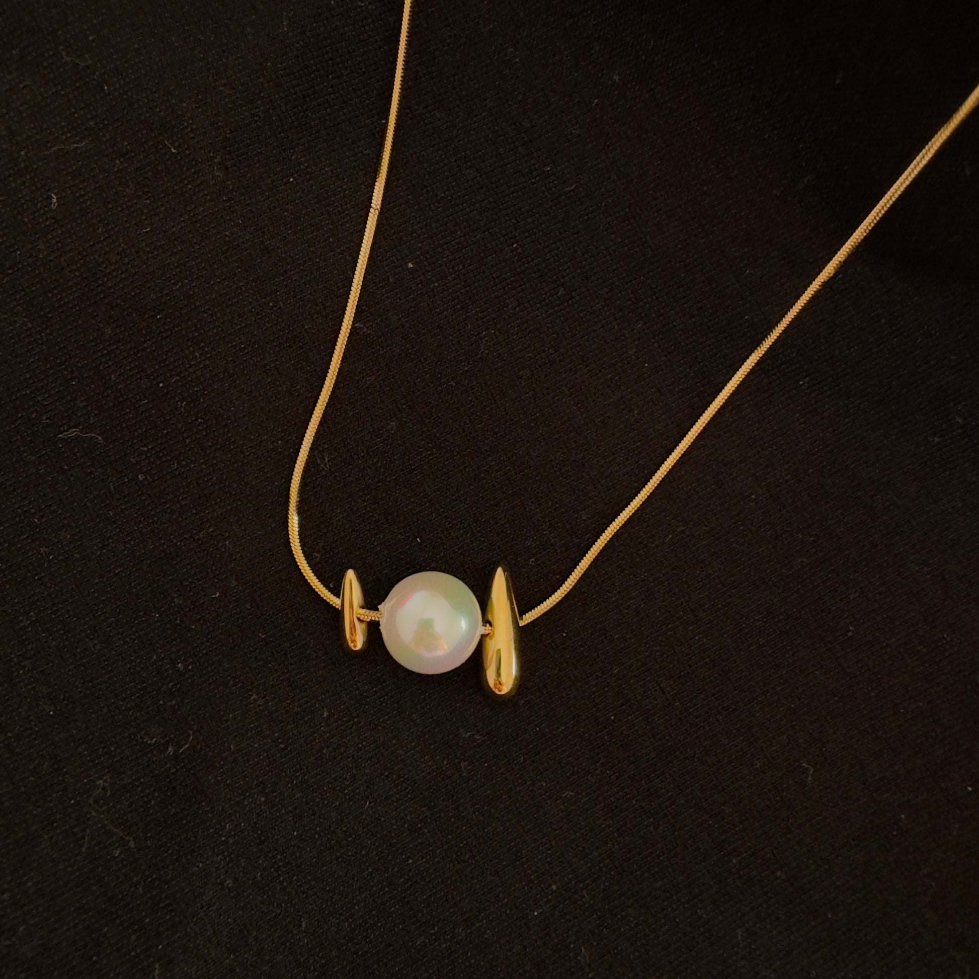 A luminous pearl framed by sculptural gold accents- modern minimalism with timeless allure. Designed with a sleek snake chain, this piece transitions effortlessly from office chic to evening elegance, whether worn solo or layered.