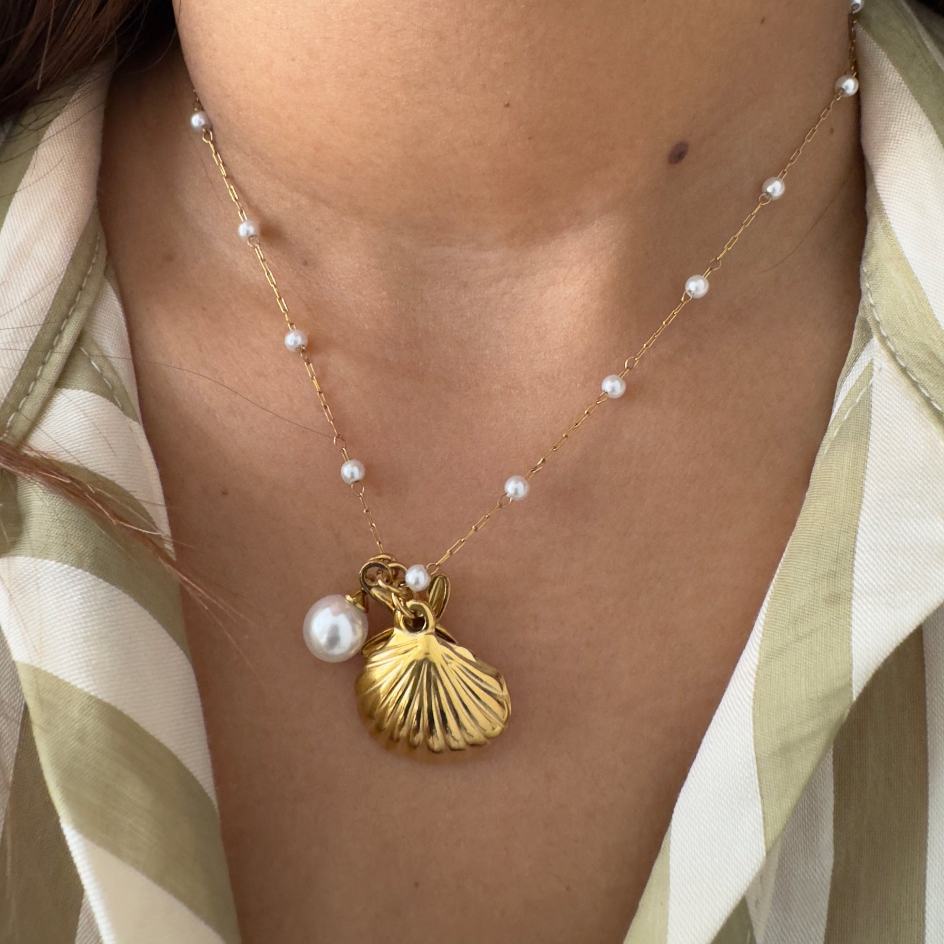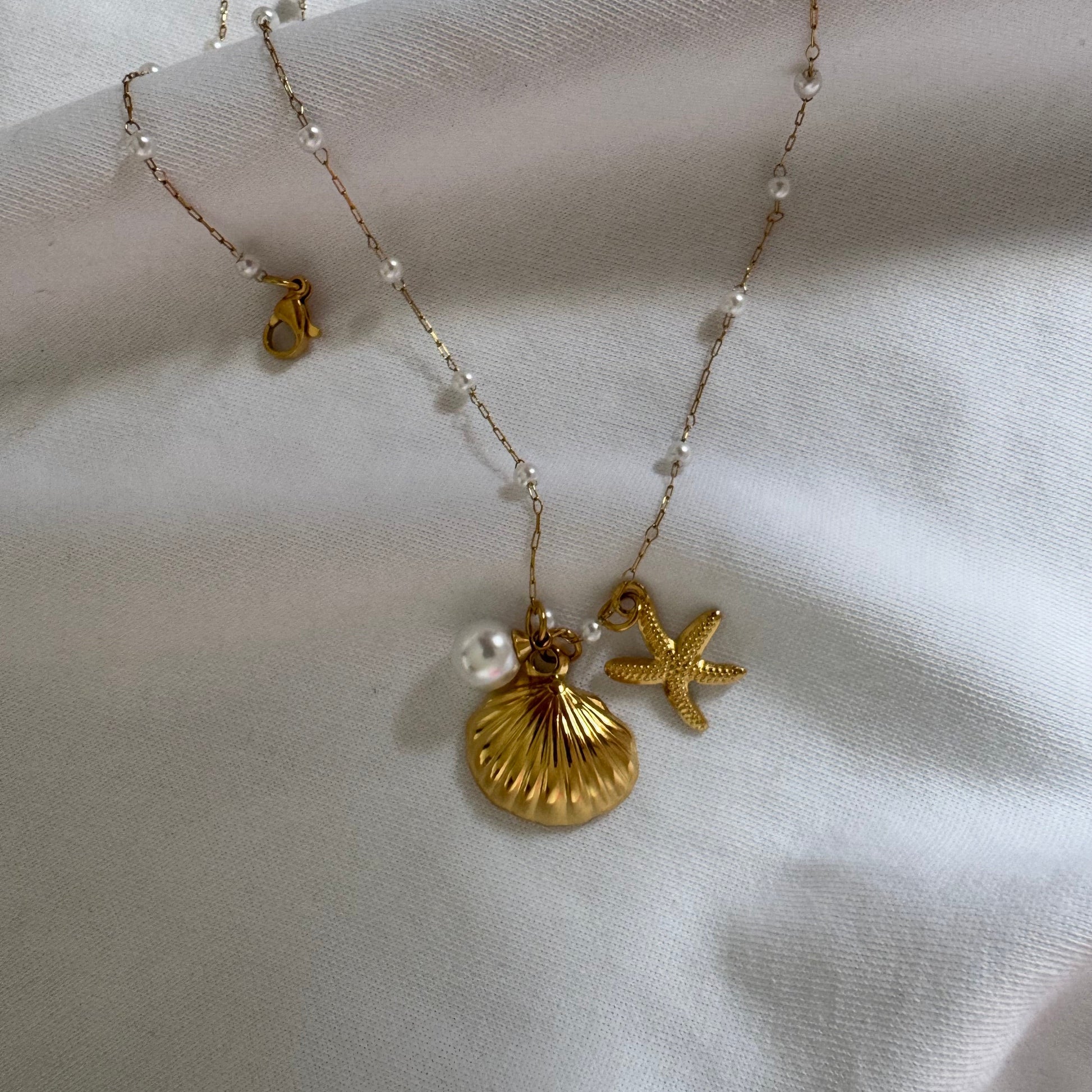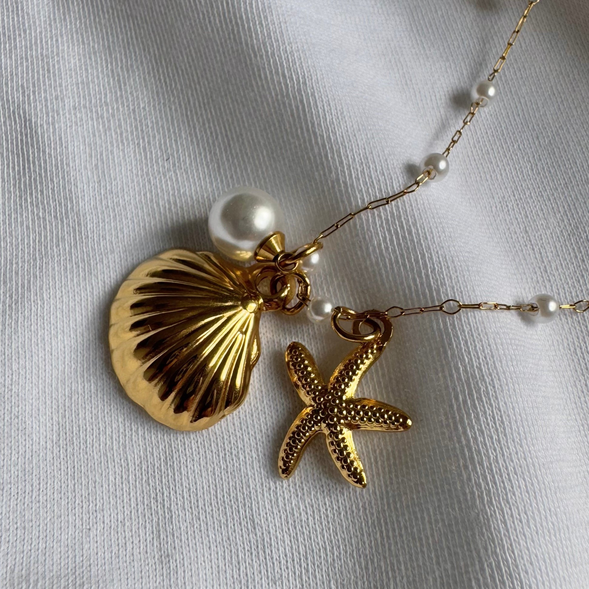 A delicate chain dotted with pearls meets ocean-inspired charms, a golden starfish, seashell, and luminous pearl. Ideal for seaside escapes or layering into your everyday look, it captures effortless summer-luxe.