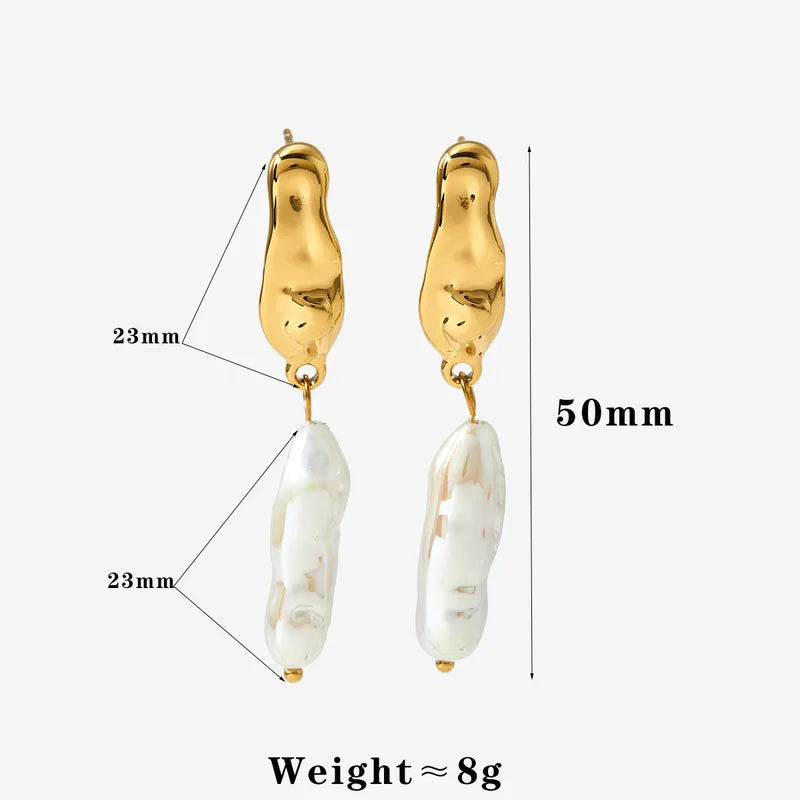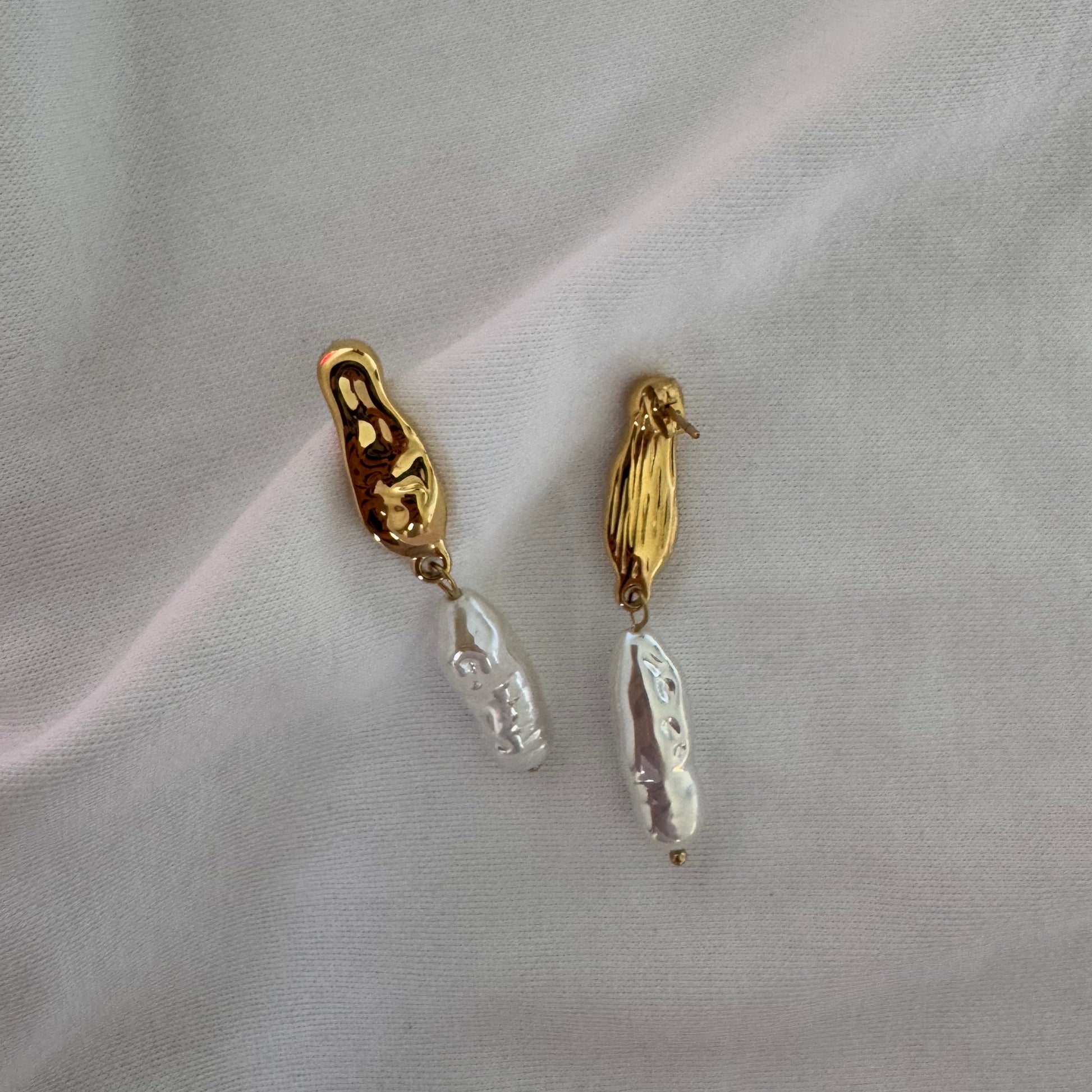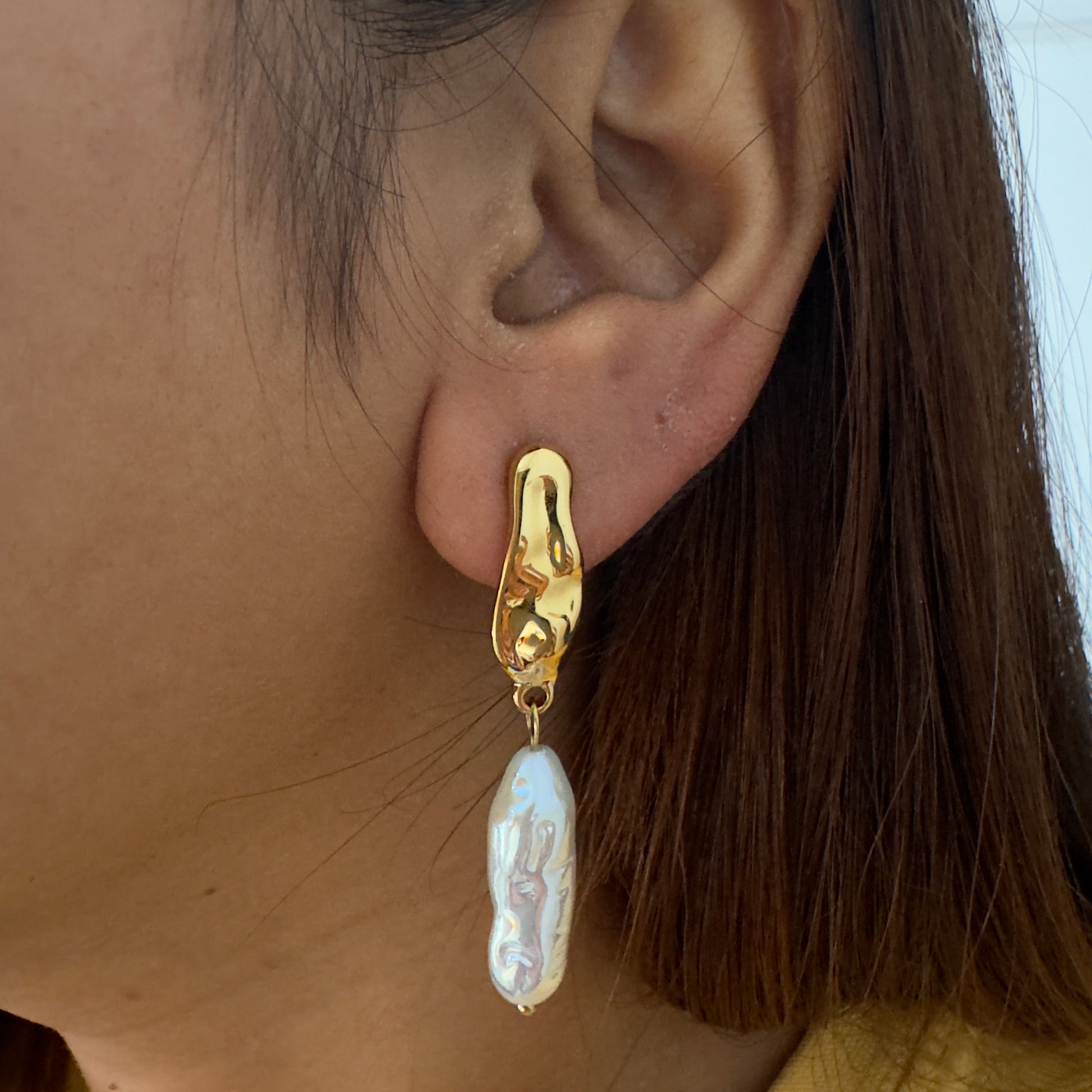 Irregular baroque pearls meet molten gold detailing in these striking drop earrings. Bold yet refined, these earrings bring artistic edge to your look- perfect for gallery days, evening dinners, or whenever you want your jewelry to speak first