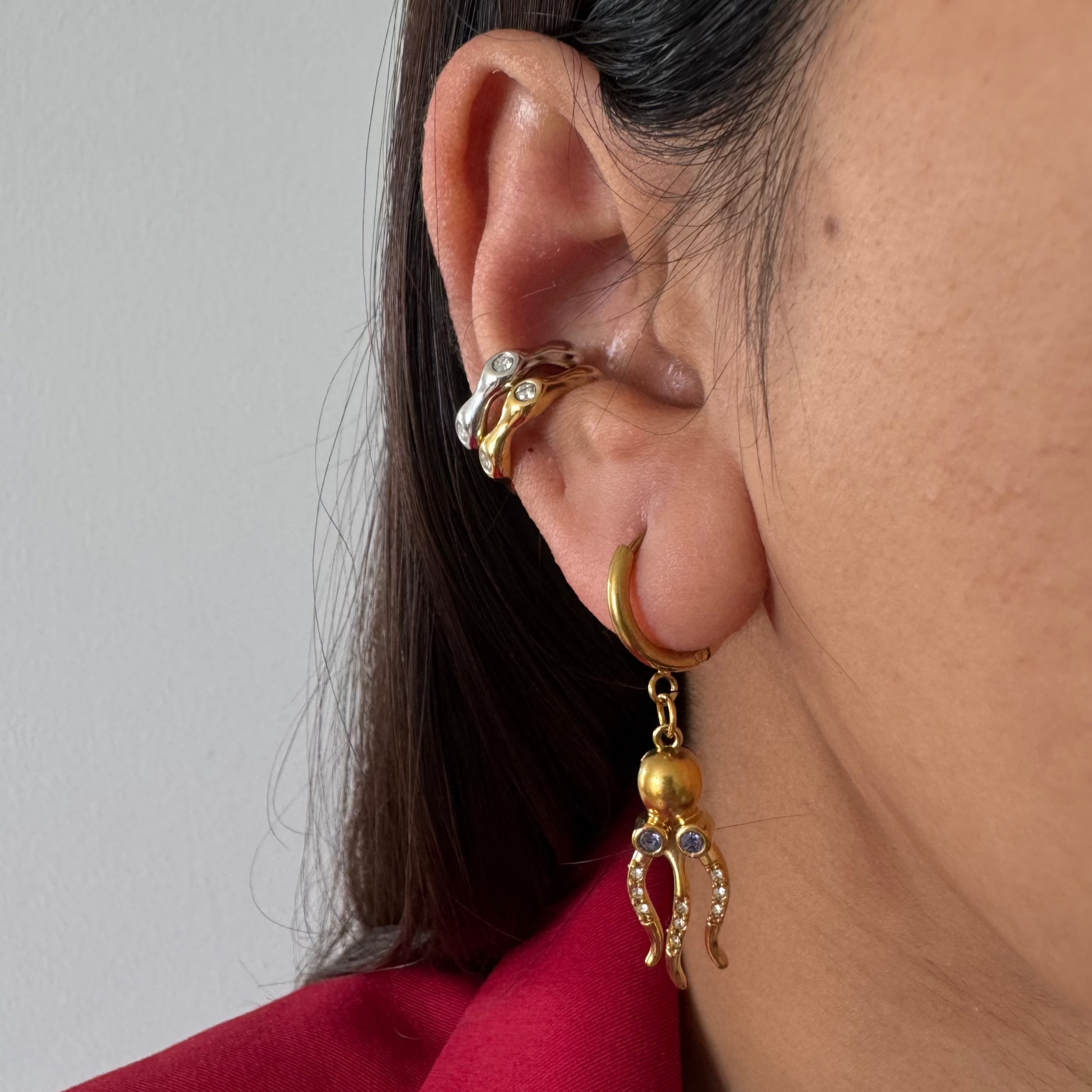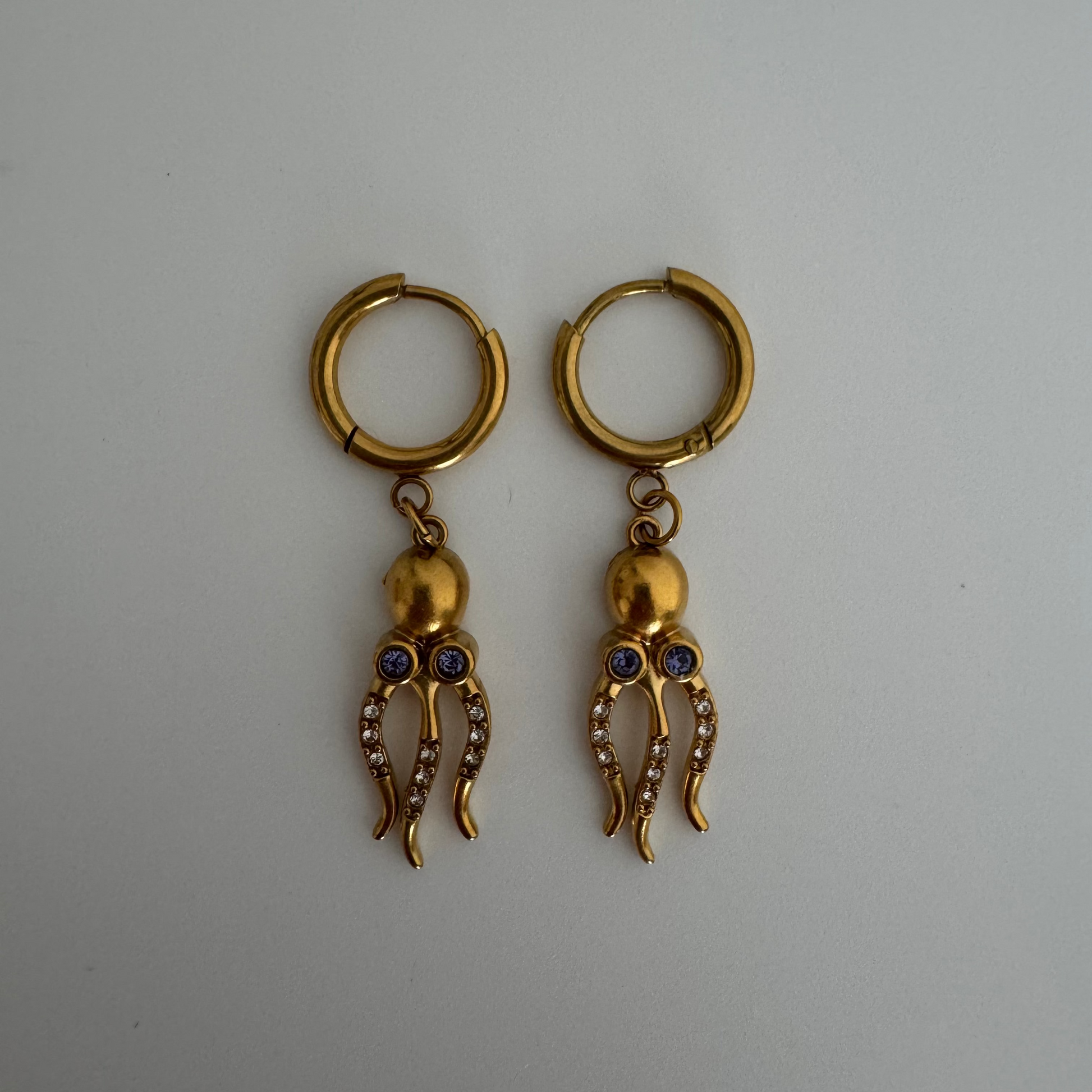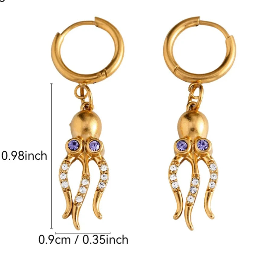 Gold-plated Huggies hoops with crystal-studded octopus charms and lilac gem eyes. Bold, playful, and sea-inspired, for days when your jewelry needs a little personality