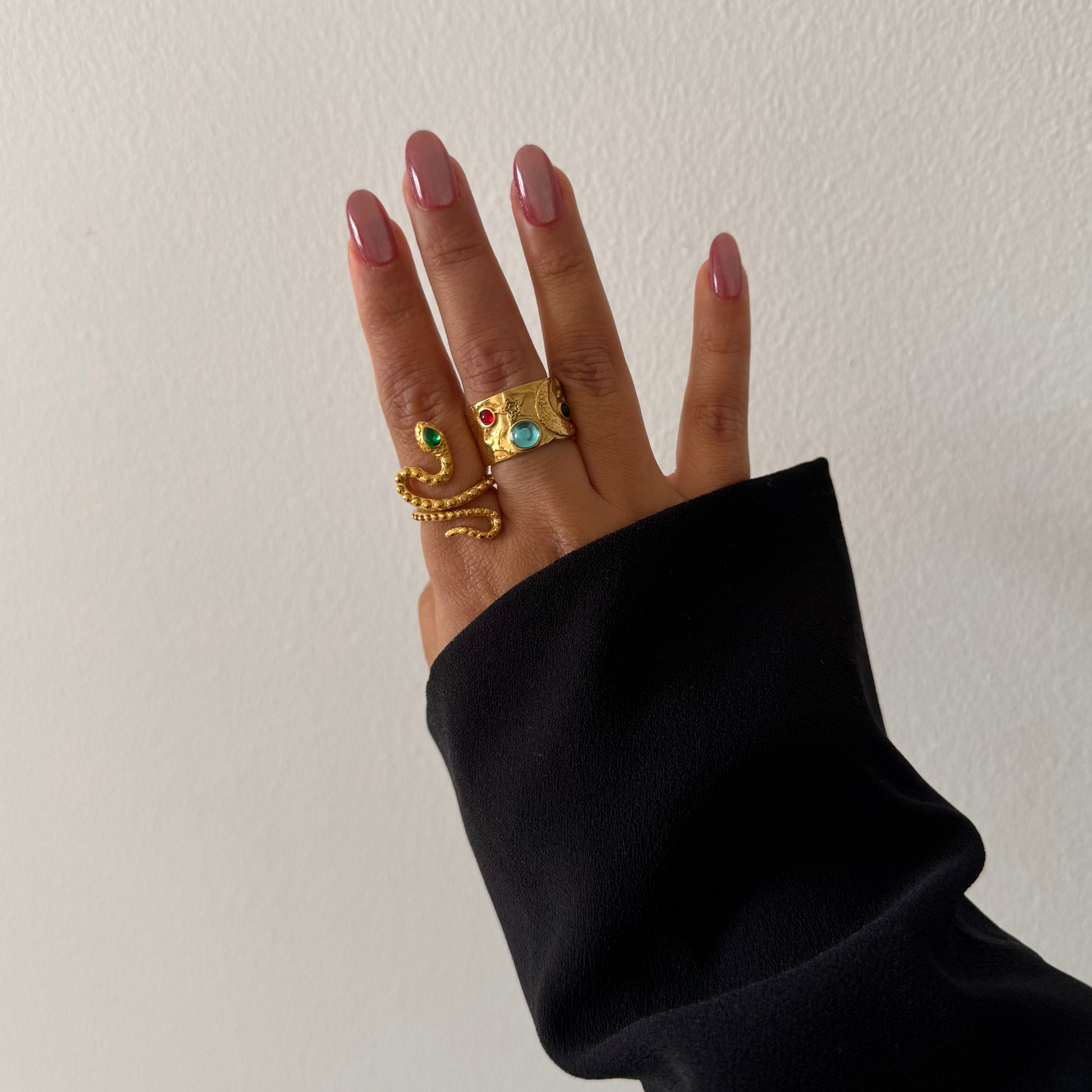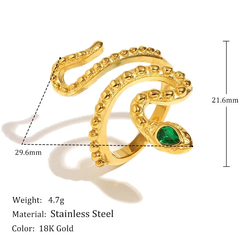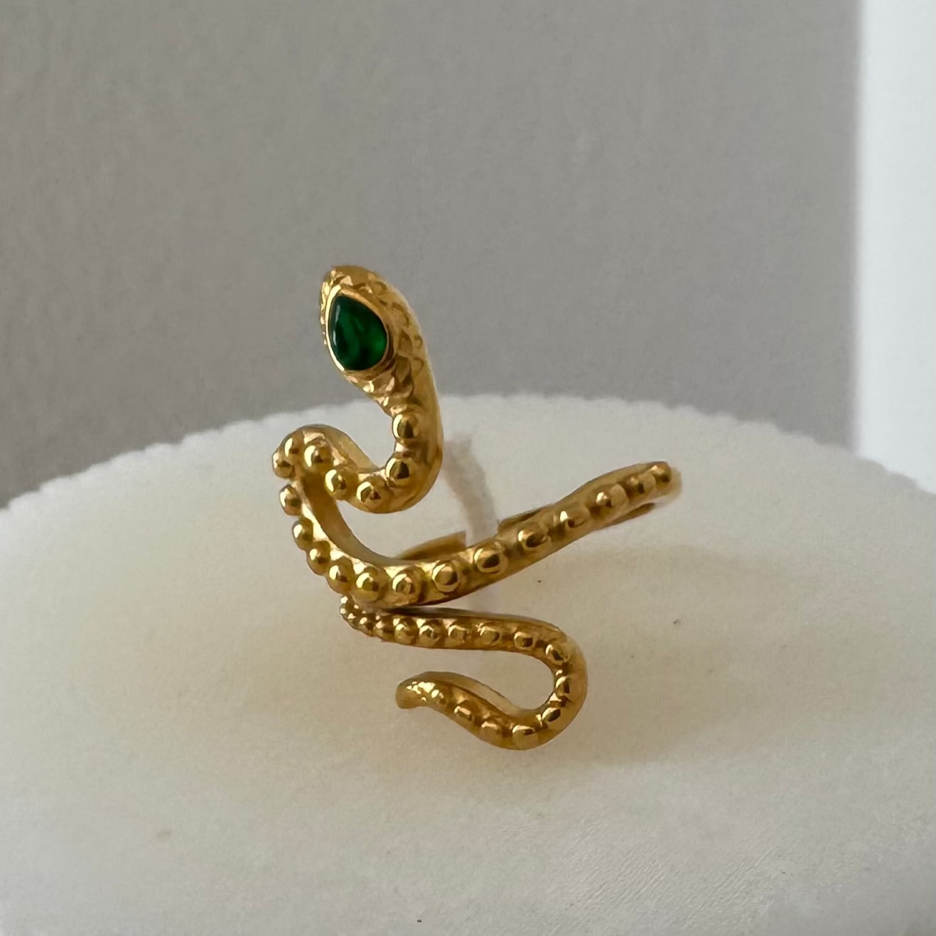 A bold serpent wrap ring plated in 18K gold, featuring textured detailing along the body. The coiled design is finished with a striking green gemstone accent, adding a touch of mystery and elegance. Perfect for making a statement with any look.