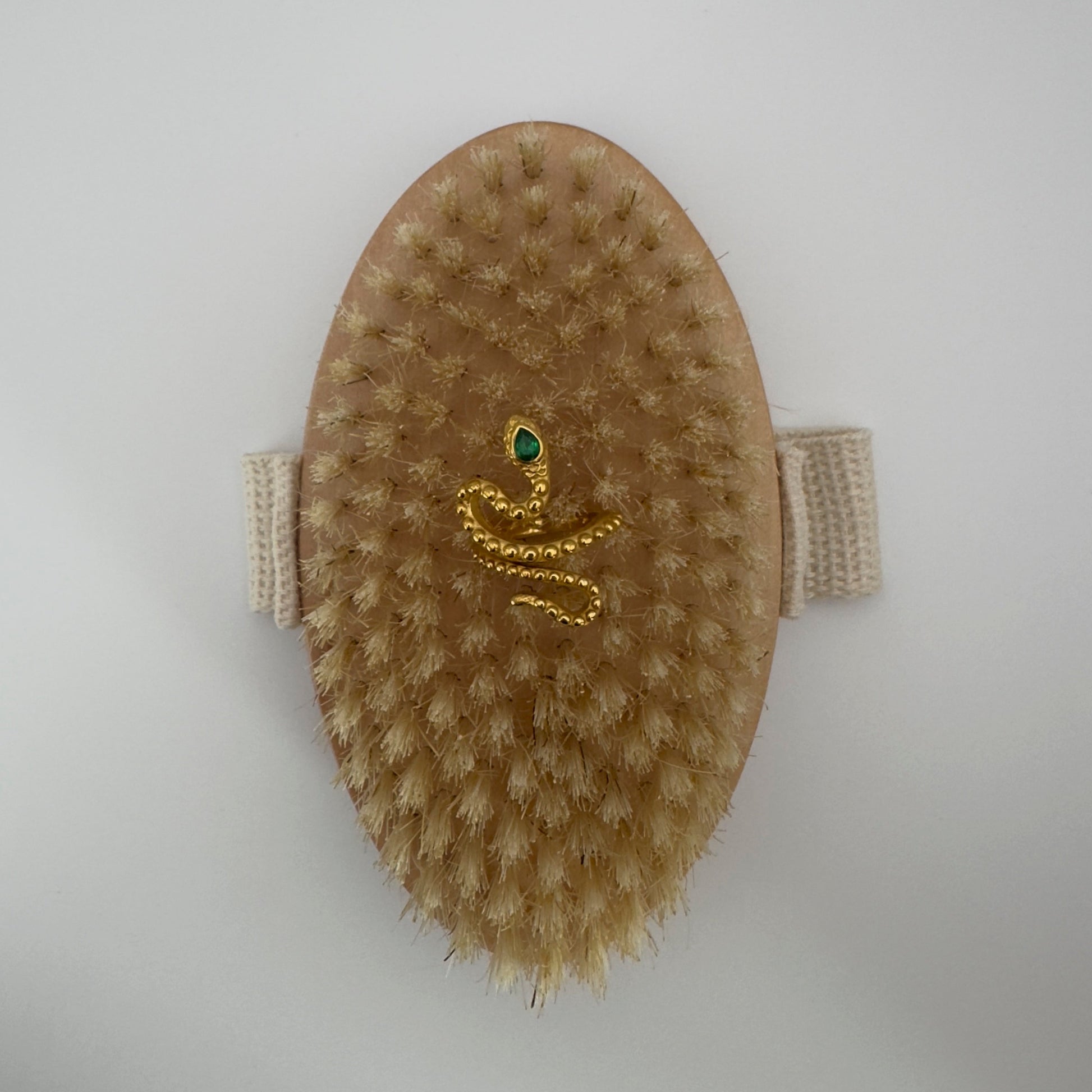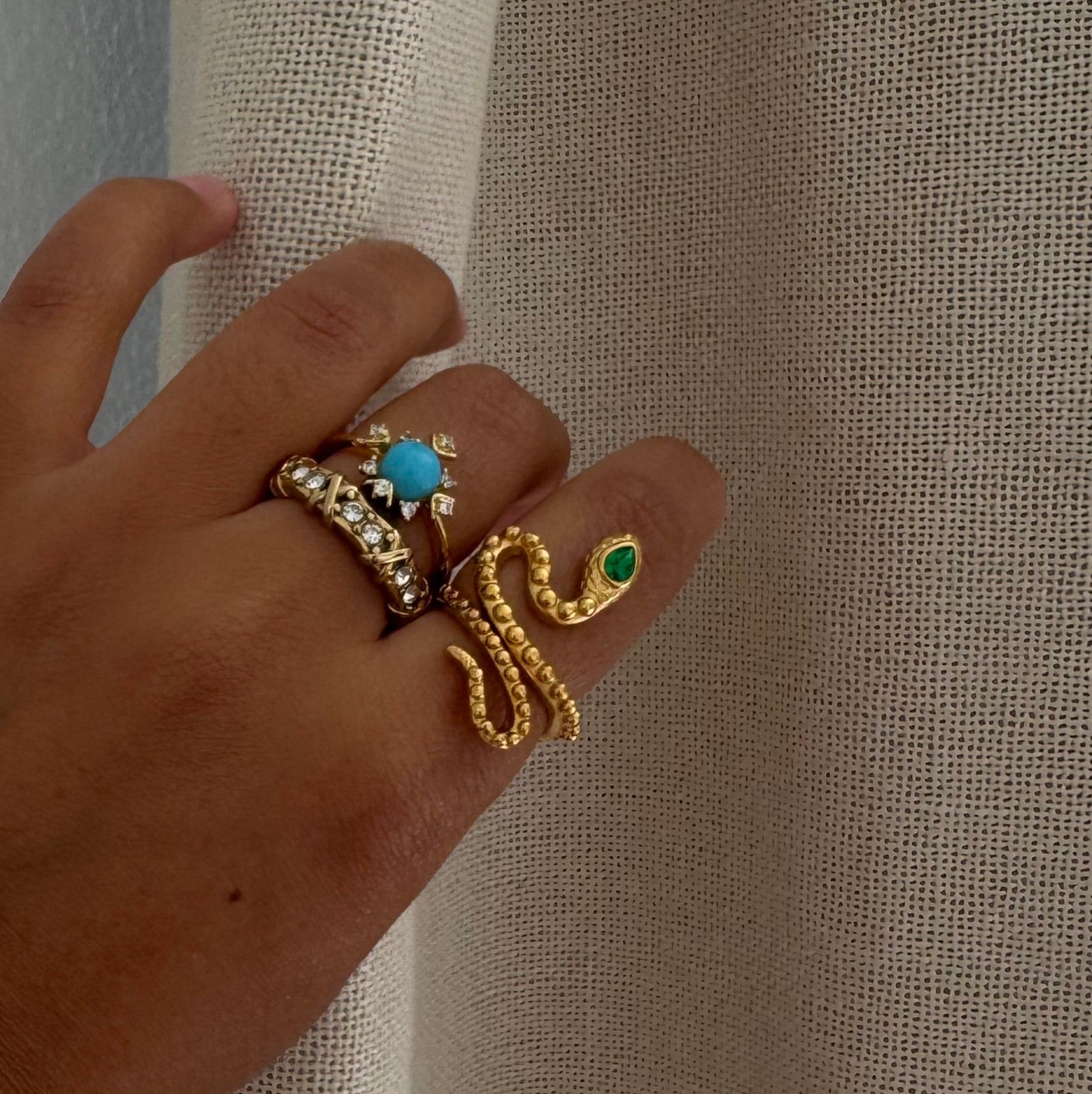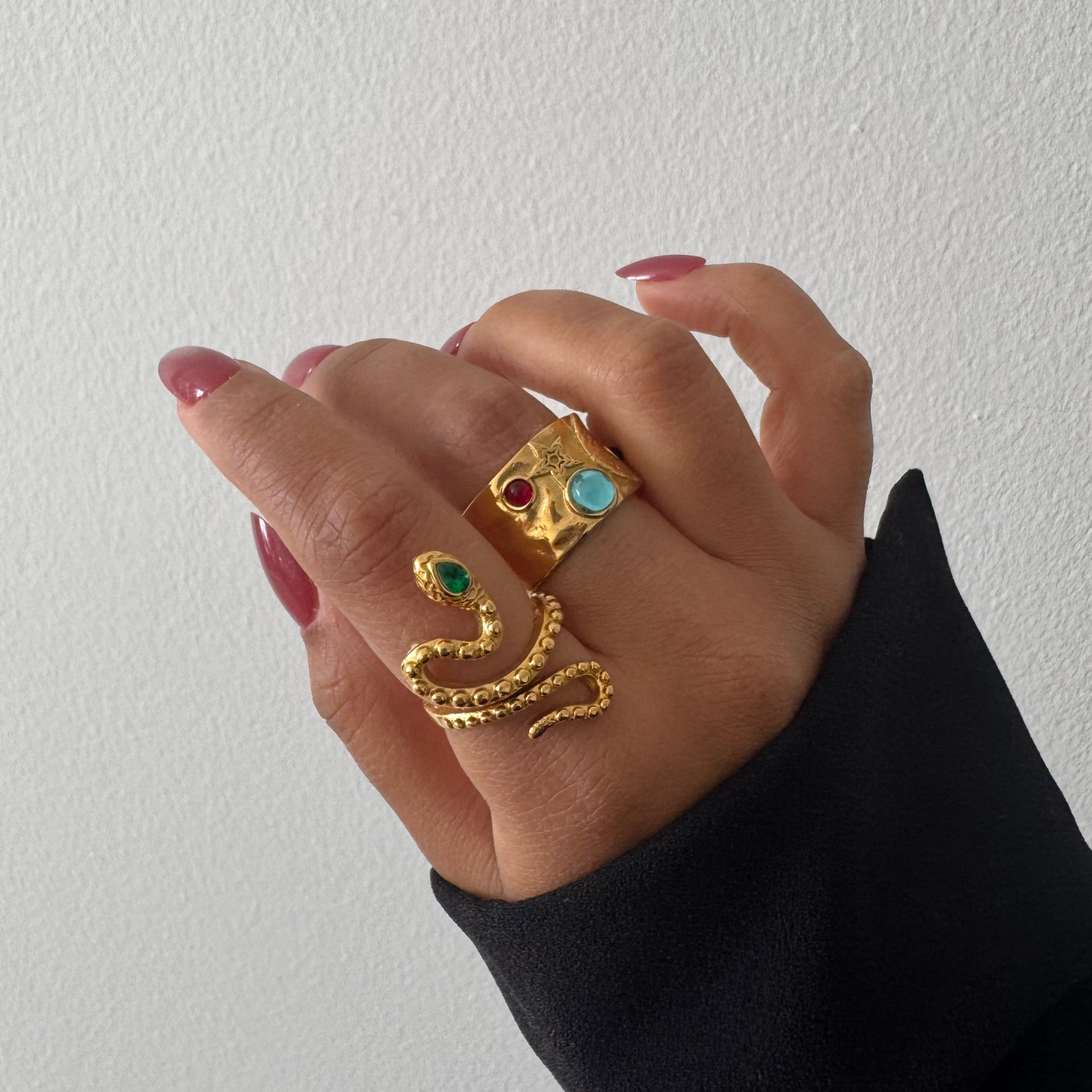 A bold serpent wrap ring plated in 18K gold, featuring textured detailing along the body. The coiled design is finished with a striking green gemstone accent, adding a touch of mystery and elegance. Perfect for making a statement with any look.